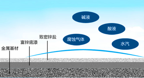 當涂膜上有部位損傷后,露出基體金屬,在較小面積內腐蝕電流能流向鋼鐵露出部分,則鋅的產物就沉積在此處形成一層保護膜,延緩腐蝕繼續發生。